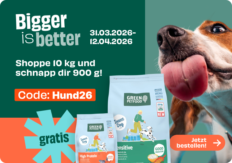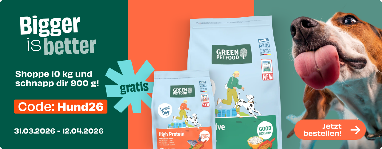 *Aktion gültig vom 31.03. bis einschließlich 12.04.2026 beim Kauf von 10 kg Green Petfood Hundefutter im Green Petfood Onlineshop unter www.green-petfood.de. Ausgeschlossen ist Katzenfutter und Zubehör. Nur solange der Vorrat reicht. Keine Kombination mit anderen Aktionen möglich.