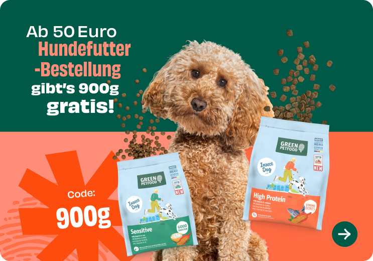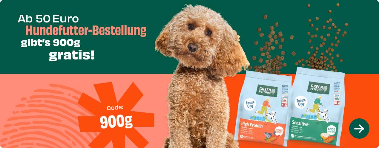 *Aktion gültig vom 06.11.–16.11.2025 auf alle Hundefuttersorten von Green Petfood. Ausgeschlossen sind alle Katzenfutter. Mindestbestellwert 50 €. Nur solange der Vorrat reicht. Keine Kombination mit anderen Aktionen möglich.