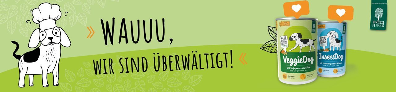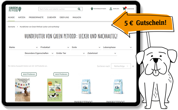 *Die Aktion ist gültig beim Kauf von Hundefutter im Green Petfood Onlineshop und läuft bis einschließlich 31.12.2022. Ausgeschlossen sind die Green Petfood Probierpakete und das Faircat Selfcare Paket. Nicht mit anderen Gutscheinen kombinierbar. Nur einmal pro Kunde einlösbar und nur solange der Vorrat reicht.